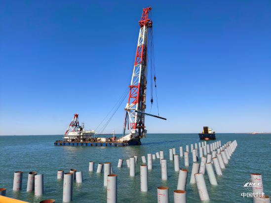項目部嚴格落實供應鏈管理提升行動要求,積極推進集約化采購,充分利用股份公司“鐵建云鏈”“鐵建云租”“鐵建商城”等數字化管理平臺,實現設備租賃采購與物資集中采購的全流程線上化、智能化,有效提升資源配置效率,推動設備物資管理精細化。在設備選用上,項目部嚴格遵循“先內后外”原則,充分挖掘內部資源潛力,強化協同作戰,采用“1艘打樁船+2艘運樁船”的“1+2”協同模式,與“鐵建樁01”密切配合,施工效率不斷突破,打樁作業單日最高完成11根,僅用2個月完成全部鋼管樁施打任務。